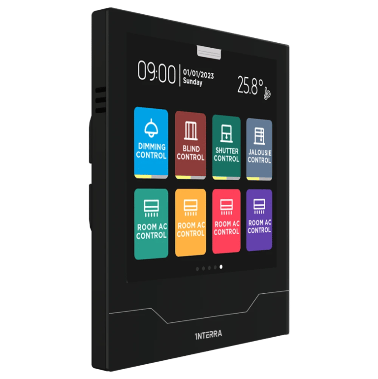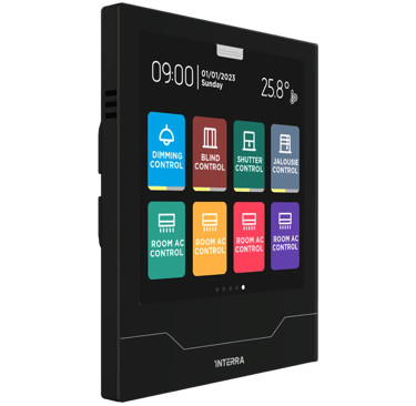 The new 4” KNX Touch Panel is a next-generation customizable mini smart home panel that provides great flexibility in room control and architectural design, offering efficient solutions for residential or commercial applications. The user-friendly and customizable interface (1x2, 1x4, 2x4) simplifies the control of smart buildings and removes complexity from your life. All pages and colors can be customized according to your needs. The Interra iX4 manages all the functions necessary for building automation with special pages for each task, including music control, switching, dimming, adjustable white lighting, RGBW control, shutter/blinds and jalousie, thermostat control, air conditioning control, underfloor heating control, timer scenarios, energy and air quality monitoring.