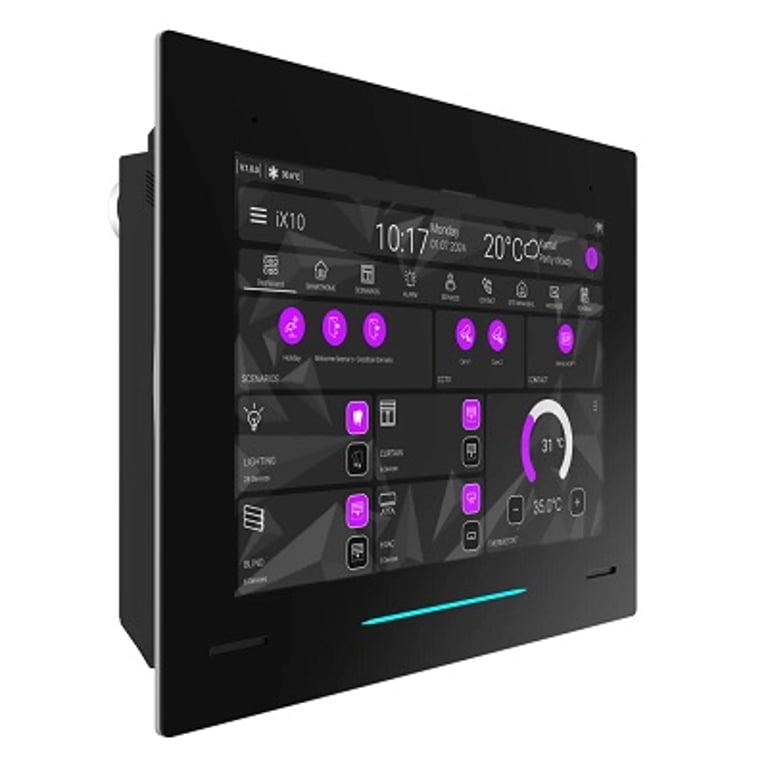 iX10 is designed as a central hub for all your automation systems. It can control a range of systems, including switches, sensors, lighting, heating, cameras, and alarms. You can control the system from your mobile device by downloading the Interra Pro app from the App Store or Google Play. For the installation and solutions of Interra touch panels, download the Interra Configurator software from the web: