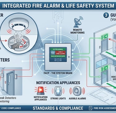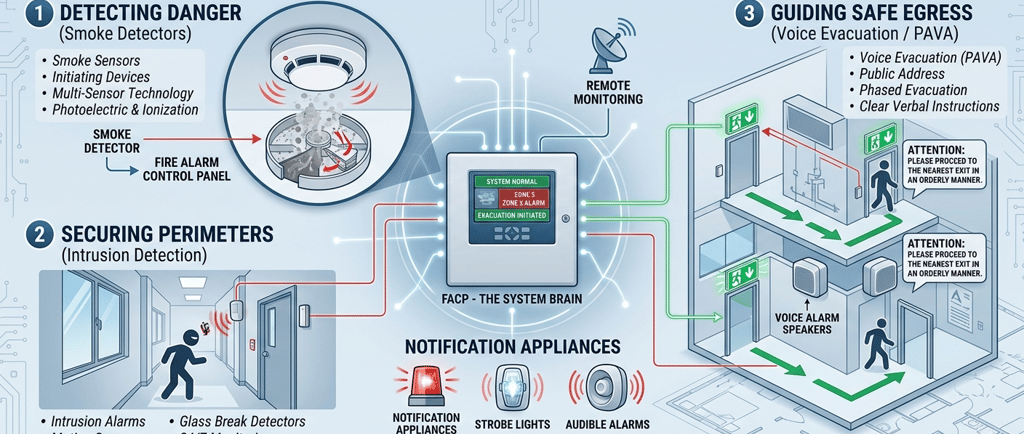 Through a combination of detection, signaling, and response mechanisms designed to identify fire hazards and alert occupants, these systems play a vital role in places where fire risks must be managed effectively to ensure safety and compliance with regulations.